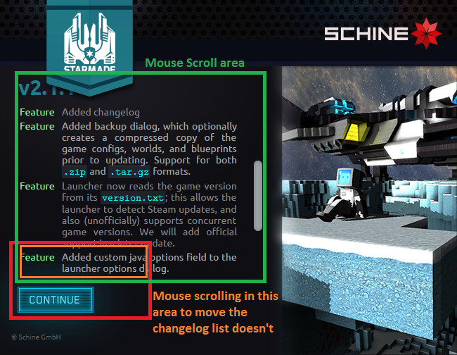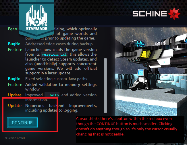 Both work as they should but there's a minor issue remaining. The CONTINUE button seems to have a larger than normal _clickable_ area (although clicking doesn't actually do anything). Both the changelog at the start and the one opened in the launcher itself have the same issue.