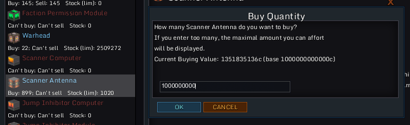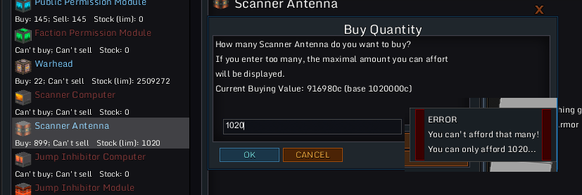 Pressing OK again brings it to 1020 now which is correct, error message this time is "You can't afford that many! You can only afford 1020" which is not true, I can afford more but it's the shop that doesn't offer me more blocks.