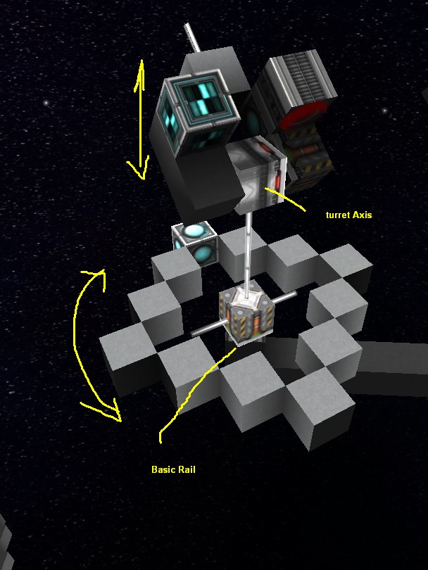 - Dock a shipcore to a rail basic, put a turret axis on this block that faces sideways.