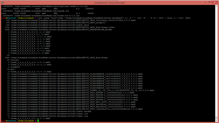 root@lordxaosa:~# lsof |grep "java"|grep "/home/starmade/StarMade/server-database"| tr -s ' ' |cut -d' ' -f 10 | sort | uniq -c | sort -k2nr