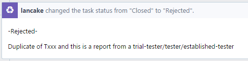 If the report is invalid (duplicate) and the author is a tester. The one who handled needs to leave a message in a comment so the tester doesn't get those 2 points for an invalid bug report: